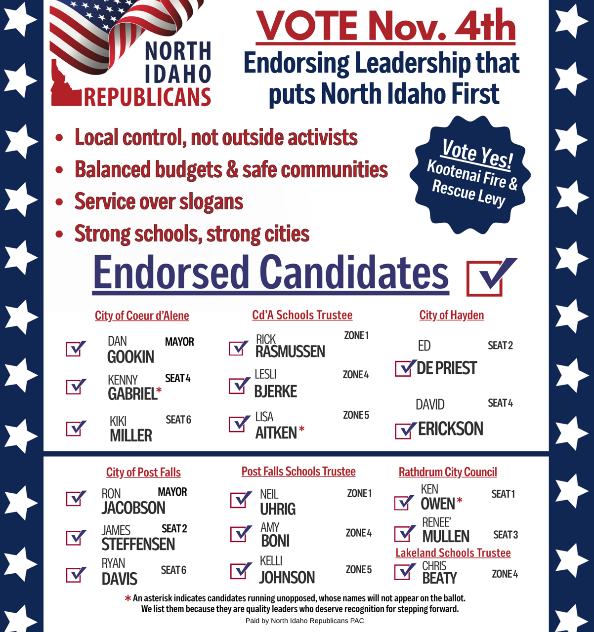 City of Coeur d’Alene— Mayor, Dan Gookin; City Council Seat 4, Kenny Gabriel; City Council Seat 6, Kiki Miller